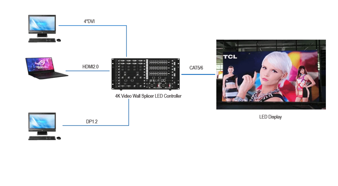 4K-videoprocessorEr is ook een 4K-videoprocessor nodig. De 4K-videoprocessor ondersteunt verschillende soorten signaalingangen, zoals HDMI, DP, enz.