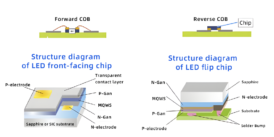 1)Flip COB structure is simpler, has simplified manufacturing process, no gold wire and better heat dissipation.
