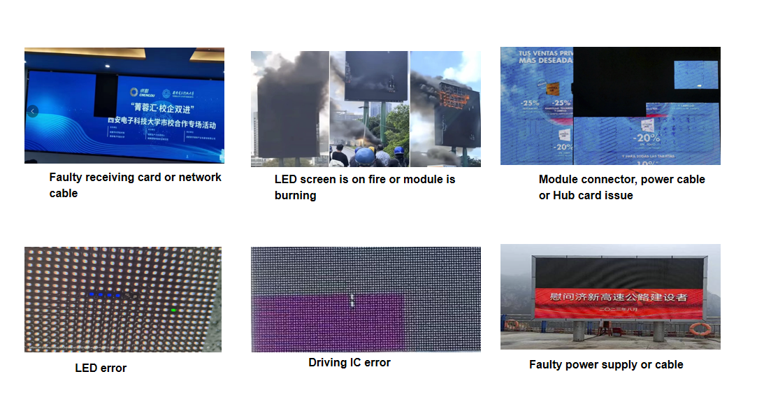 Our LED panel represents a revolutionary advancement in high-tech outdoor LED display products, distinguished by the following advanced features: Module Spot Check Function, Voltage Monitoring, Module Connector Detection and Module Operating Temperature Detection. The following images depict some common issues encountered with LED displays available in the market. When similar problems arise, users utilizing our advanced systems and designs will receive prompt notifications via email, allowing them to address the issue swiftly.